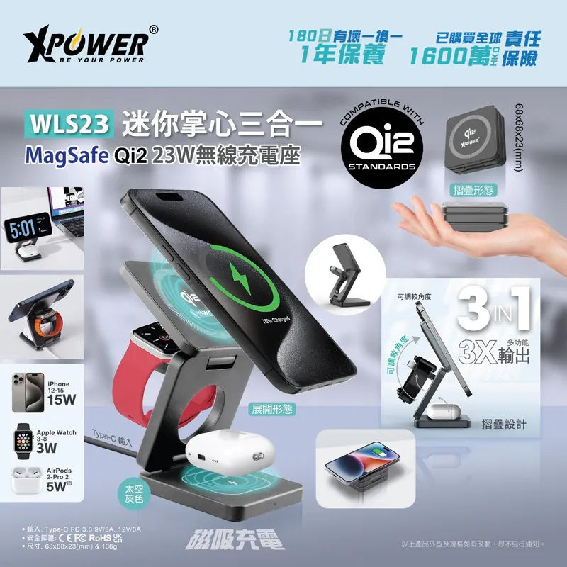 XPower WLS23 3合1 Qi2 23W MagSafe磁吸無線充電座